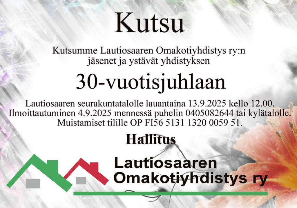 Kutsumme Lautiosaaren Omakotiyhdistys ry:n jäsenet ja ystävät yhdistyksen 30-vuotisjuhlaan Lautiosaaren seurakuntatalolle lauantaina 13.9.2025 klo 12.00. Ilmoittautuminen 4.9.2025 mennessä puhelin 040 508 2644 tai Kylätalolle. Muistamiset tilille OP FI56 5131 1320 0059 51.
